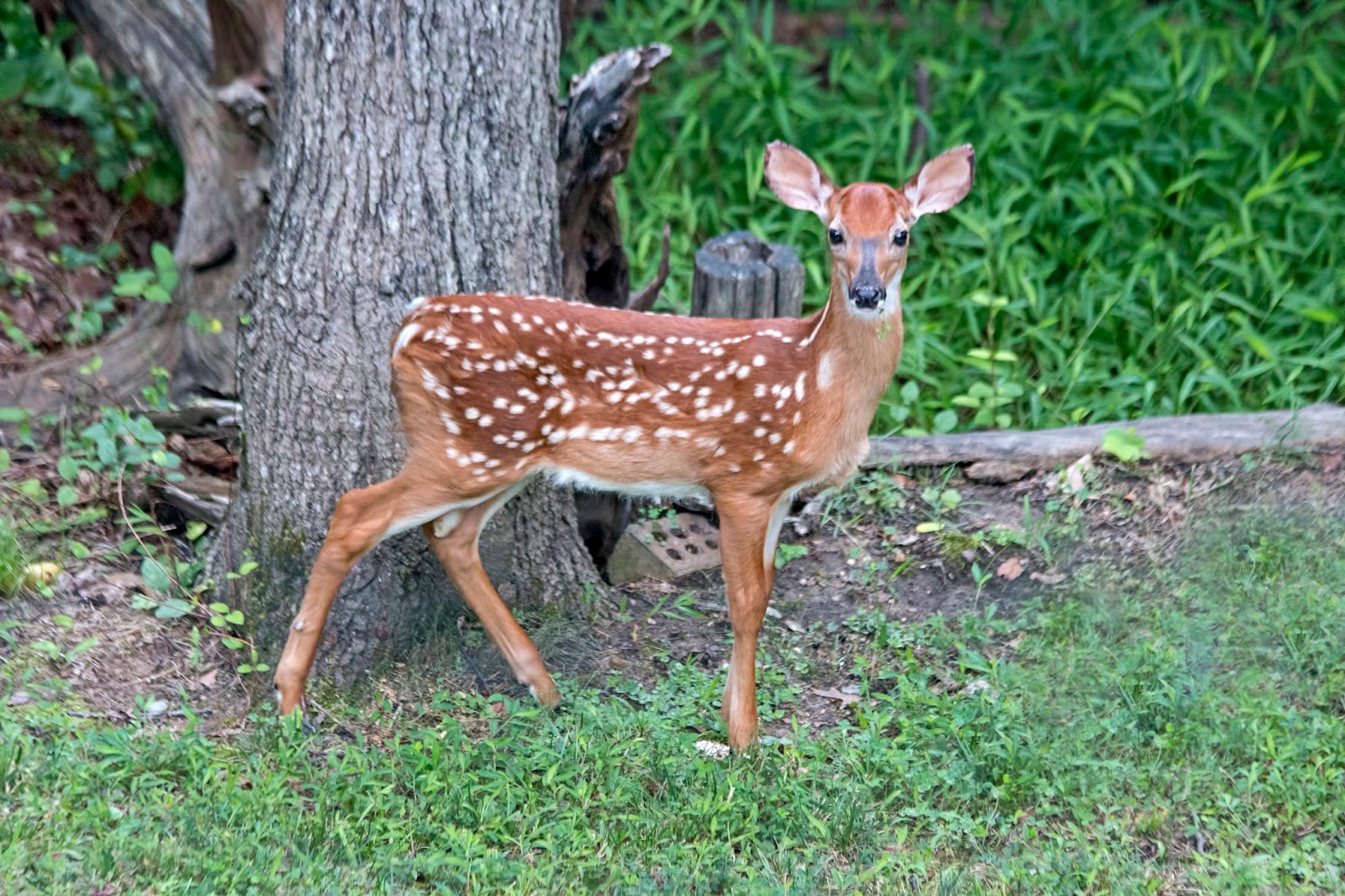 A change but not uncommon finding was the bottom jaw with tiny teeth of a fawn near our path to the dock. We had seen buzzards flapping awkwardly onto tree branches in that area, but thought nothing of it as we were packing for a trip. By the time we returned there were just a few bones left beside the jawbones and these were being eaten by beetles. We had not seen any fawns this year and while we have an ongoing battle with the deer eating landscape plants at the driveway entrance, we were also sad not to see the dappled backs of the new young ones with their soft brown inquisitive eyes. Yesterday, while I was making quiche for dinner, I looked out the kitchen window as I often do and saw this young one.